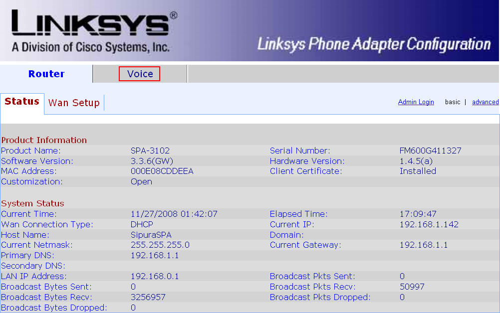 Linksys SPA 3102 VOIP Advanced Admin Login  settings page