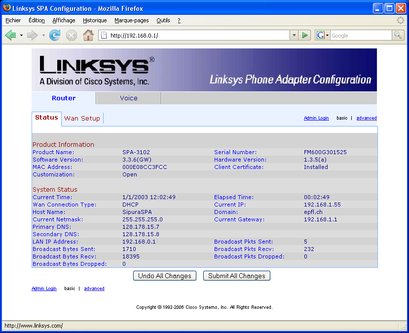 Votre appareil est maintenant configuré. Vous devez entendre la tonalité en décrochant le combiné. En retournant à l'onglet "Status", vous pouvez voir que l'appareil est connecté à notre serveur ("Registration State: Registred").
