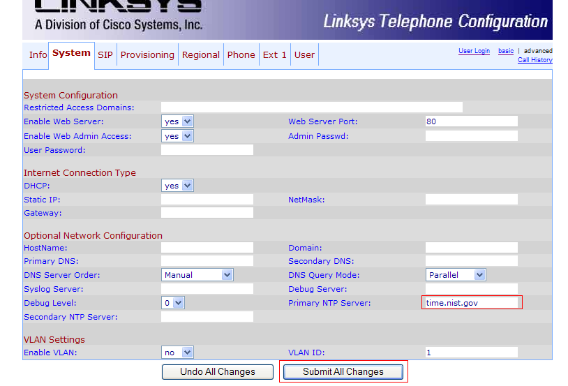 Le réglage de l'heure par l'interface web est relativement complexe pour le SPA-901. Nous vous montrons ici comment le configurer pour utiliser le bon fuseau horaire et suivre automatiquement les changements d'heure d'été/hiver. Pour ces réglages particuliers, il nous faut passer en mode "advanced".